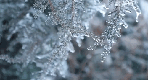 成片的樹枝上包裹著晶瑩剔透的冰掛,在陽光下的照射下,好似身披琉璃冰裳。銀枝玉葉,裹挾著一串串冰瑩的藤條垂滿枝頭,結出一朵朵冰花,那搖搖欲墜的美,恍如身處仙境,頗有一番奇幻色彩。