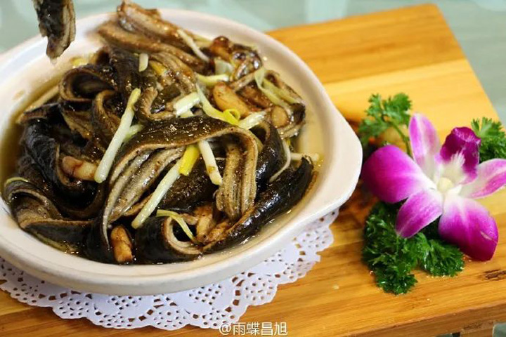 “軟兜長魚”是淮揚菜中最負盛名的一道菜肴,用料必須是黃鱔的脊背肉。