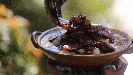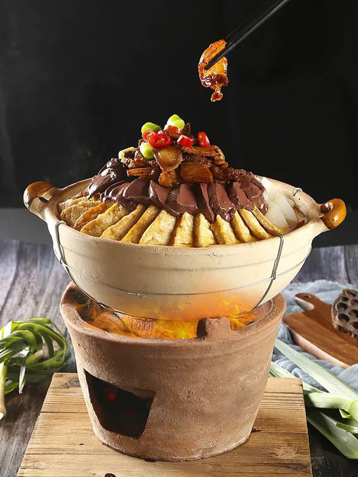 黃泥小風爐,炭火生起,高山蘿蔔、大塊豬血、煎至金黃的農家鹽滷豆腐鋪底,蓋上一層噴香的五花肉。喊上鄰里,圍爐而席,湯汁微沸的咕咚冒泡聲,鼻聞香氣四溢,一鍋菜,五感交融。
