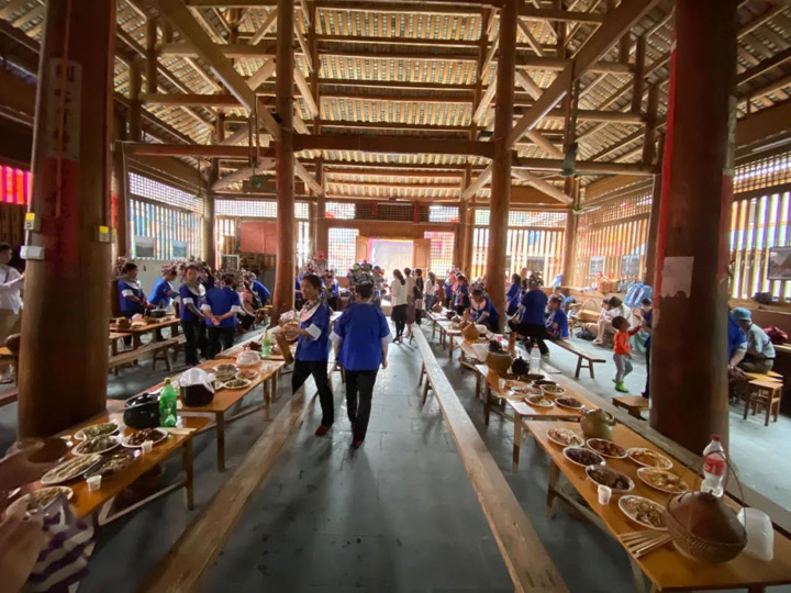“百家宴”是侗族待客的最高禮儀。每逢村寨互訪或有特別尊貴的客人來時,全村各戶自備酒菜飯,一起到鼓樓坪“一”字型擺開長桌,客人可從第一桌吃到最後一桌,你來我往、觥籌交錯、熱鬧非凡。據說在當地流傳著這樣一個說法:“吃百家飯、納百家福、聯百家心、驅百家邪、成百樣事、享百年壽”——各寨