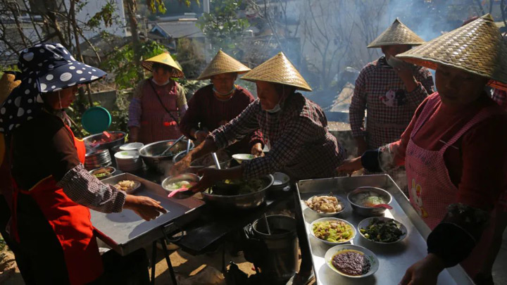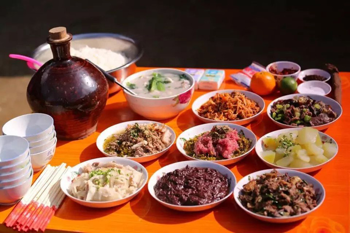 在很多地方的鄉村都有著進入冬月吃年豬飯的習俗。年豬飯,就是每家把精心養了一年的大胖豬殺了,來宴請鄰里鄉親及其遠方的親朋好友。一般集中於十二月中下旬,尤其在每年冬至前後,村村寨寨年豬飯飄香。