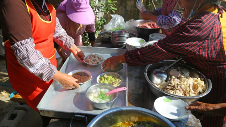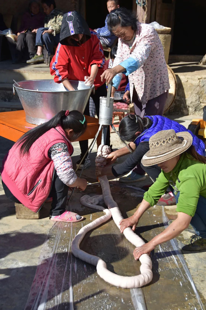 吃過午飯後的閒暇時光,很多鄉親會幫著主人家一起做灌腸。分工明確,拌料、裝料、輔助料順利灌入腸中、打結......緊密配合,忙碌有序。