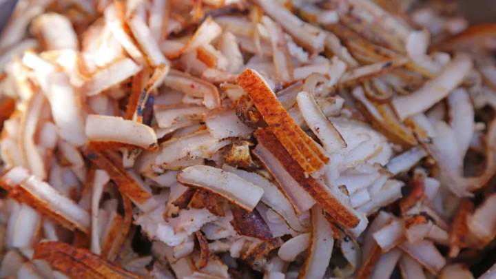 烤完五花肉的炭火可以接著做火燒皮,在炭火上烤至豬皮微卷,有些焦黃,趁熱直接放到水中還發出滋滋的響聲,浸泡20分鐘後洗淨切成片,拌水醃菜加點兒肉末。