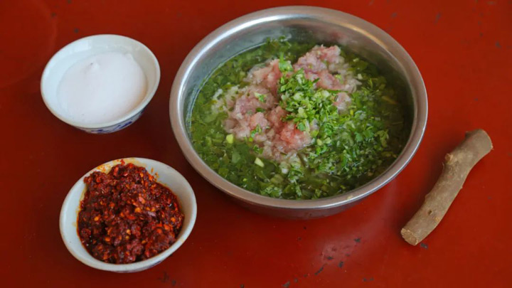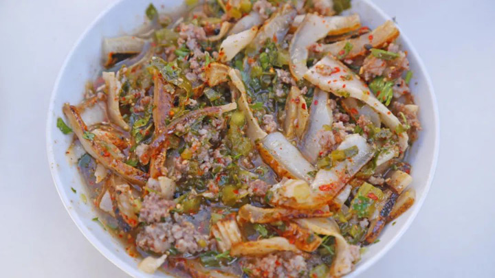 火燒皮Q彈有嚼勁,混著肉末的香味加入自家醃的水醃菜,酸辣味兒刺激到味蕾,能夠多吃好幾碗米飯。