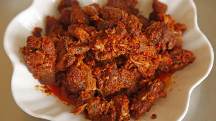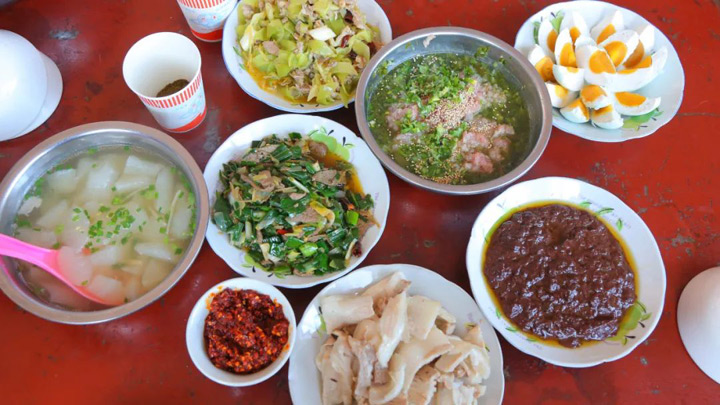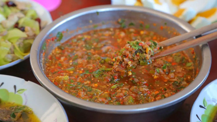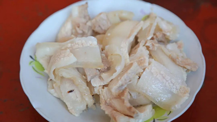 豬血加入醃菜水、花椒粉、草果粉、鹽等各種調料炒熟作為蘸料,然後搭配煮熟切成片的五花肉。
