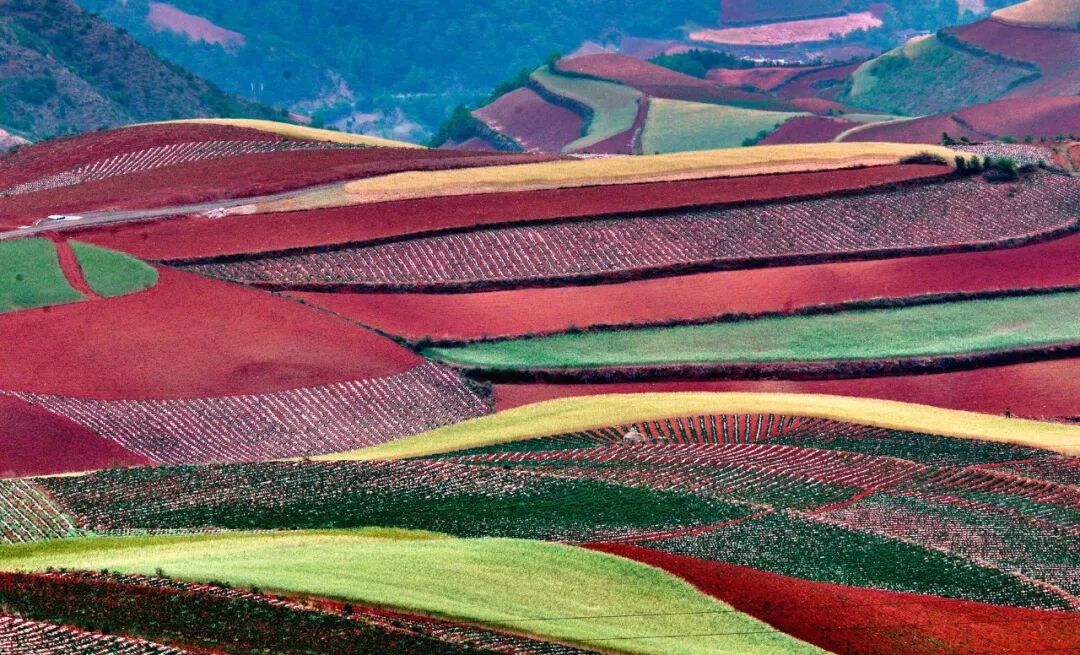 東川紅土地位於昆明市東北,因土壤裡含鐵、鋁成分較多,就形成了炫目的赤紅色彩。土地被田地和農作物分割成一個個色塊,遠遠看去,五彩斑斕,襯以藍天白雲,更為壯觀。
