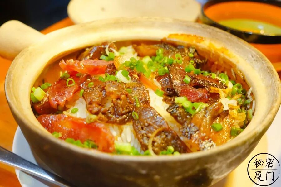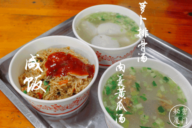 咸飯上面淋著廈門辣醬,飯裡有香菇、蘿蔔、排骨肉,特別的香。雖然看似簡單,但它也是廈門每次過節時家裡必不可少的一道主食。