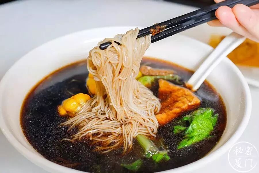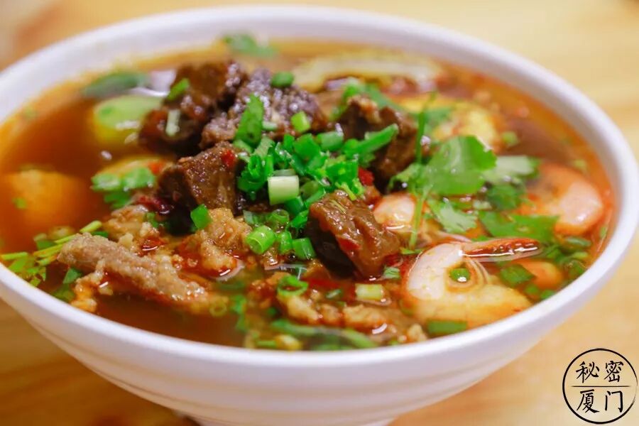 台式的紅燒牛肉麵結合廈門口味,配上微辣口感的濃郁湯底,加上自選的澆頭:紅燒的牛肉、腍滑的牛腩、Q彈的肉丸,還有一些閩南特色的輔料。無論是晚餐還是解酒時來上一碗都是很棒的。