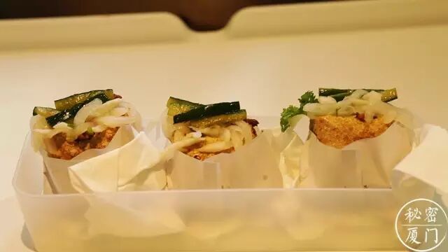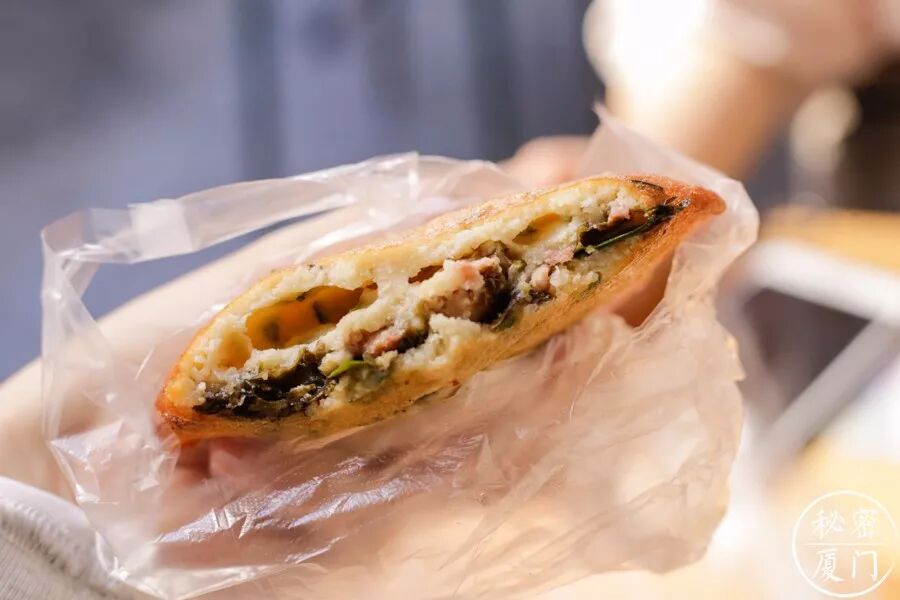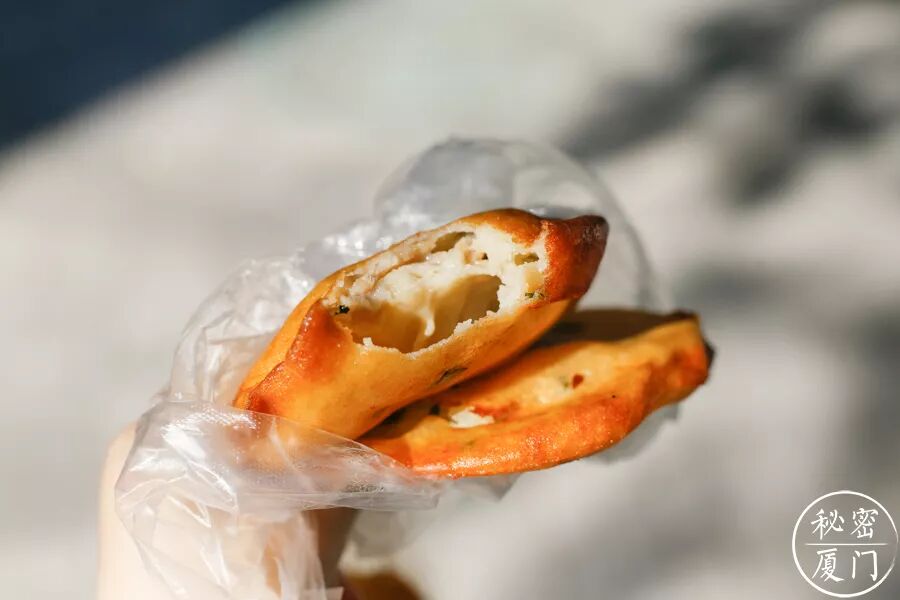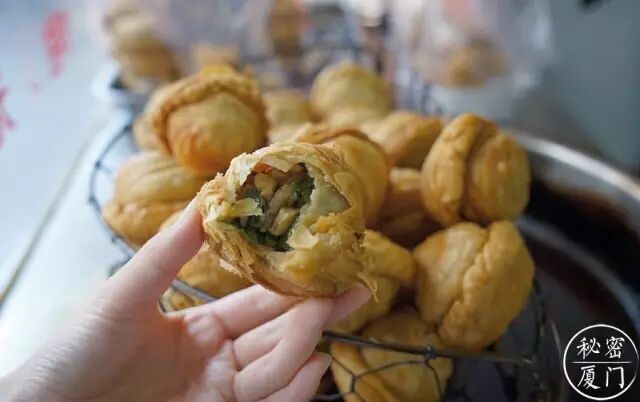 韭菜盒是廈門當地的特色小吃,就如同它的名字一樣,小小的餅盒把韭菜、豆皮、筍等餡料包在裡面,外酥裡香,是不少閩南人喜歡的茶配。