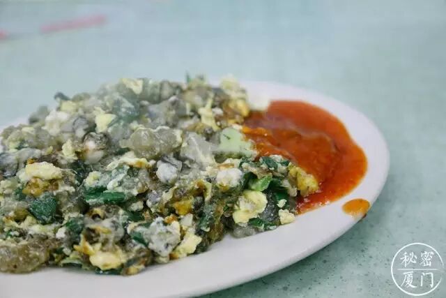 海蠣煎要現做的才好吃,將海蠣裹上地瓜粉,倒入鐵盤中,淋上一碗雞蛋液,翻炒幾下後撒上青蒜葉,裝盤,淋上一點廈門辣椒醬,味道絕了!