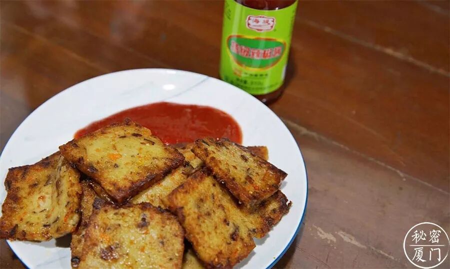 咸粿是廈門人過年家裡常備的一道菜,過年期間父母會委託商家做上一大份,然後再切成一小塊一小塊送給親朋好友。不起眼的外觀,只需要用小火煎得兩面焦黃,就立馬變身為一道美味小食。