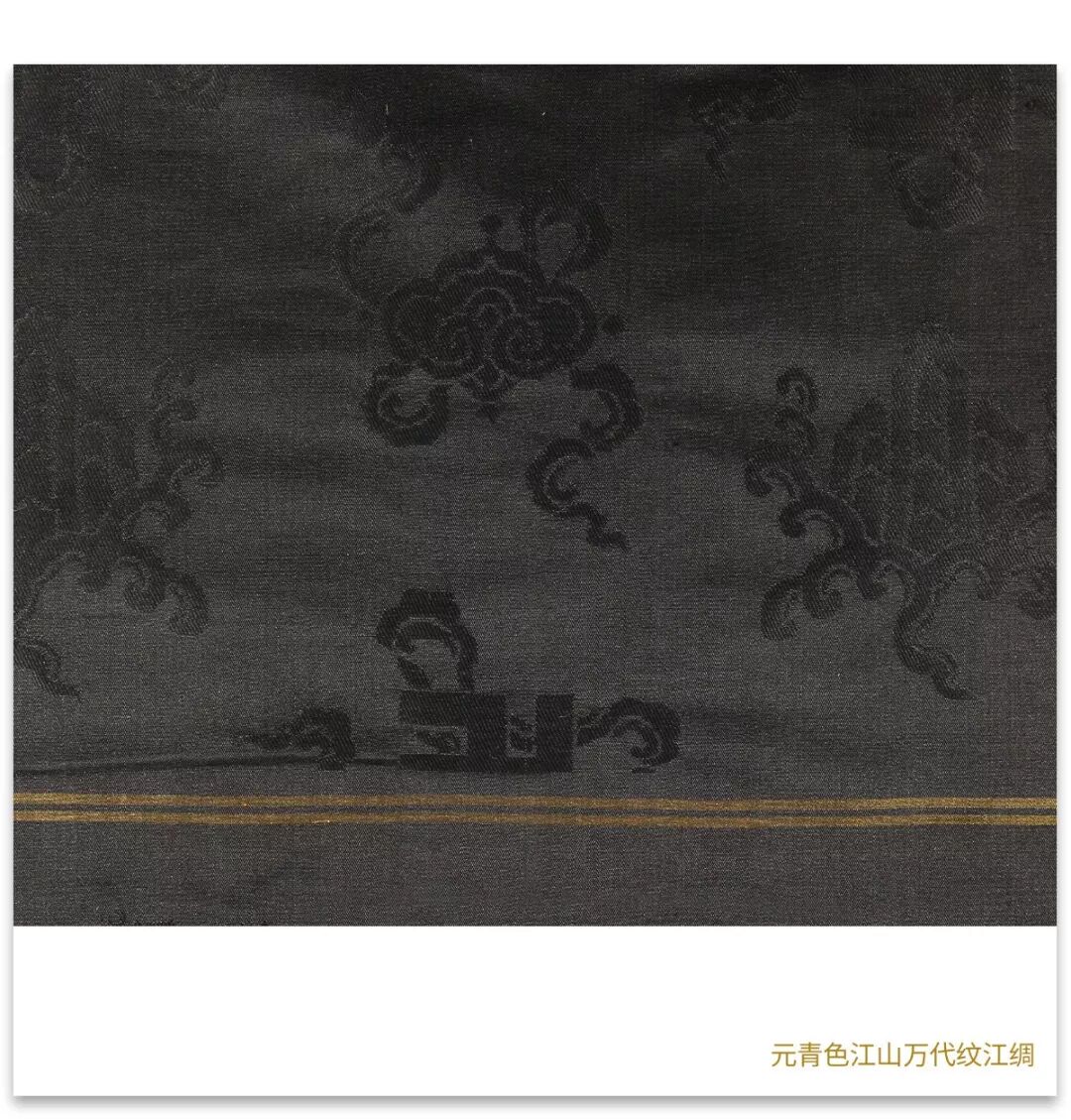 此匹料機頭款為“江南織造臣克明額“,黃封上墨書“上用元青江山…”,宮廷在向江南三織造派織的品種裡,元青是必不可少的。