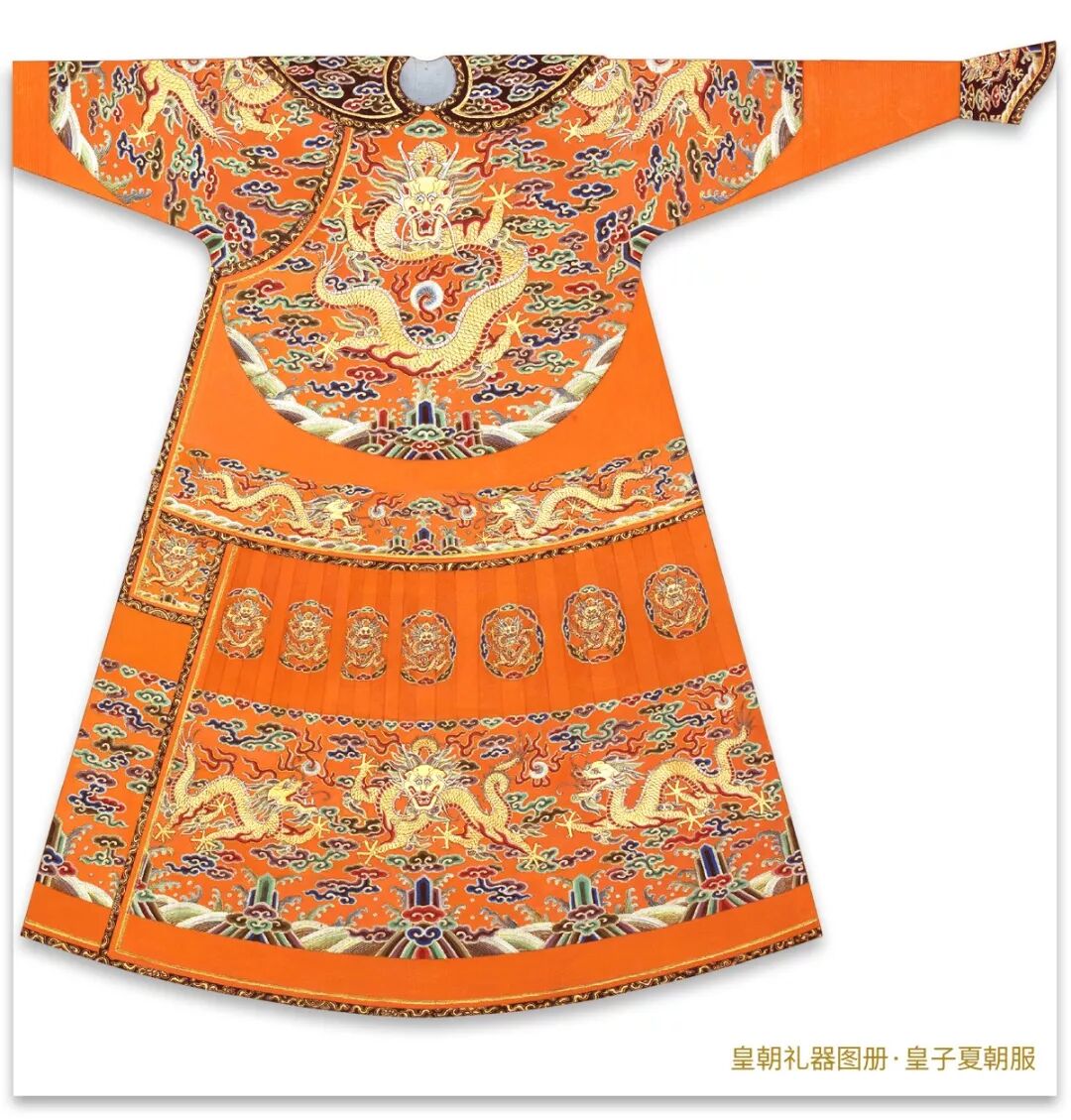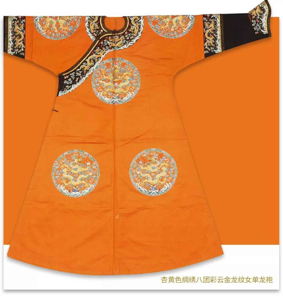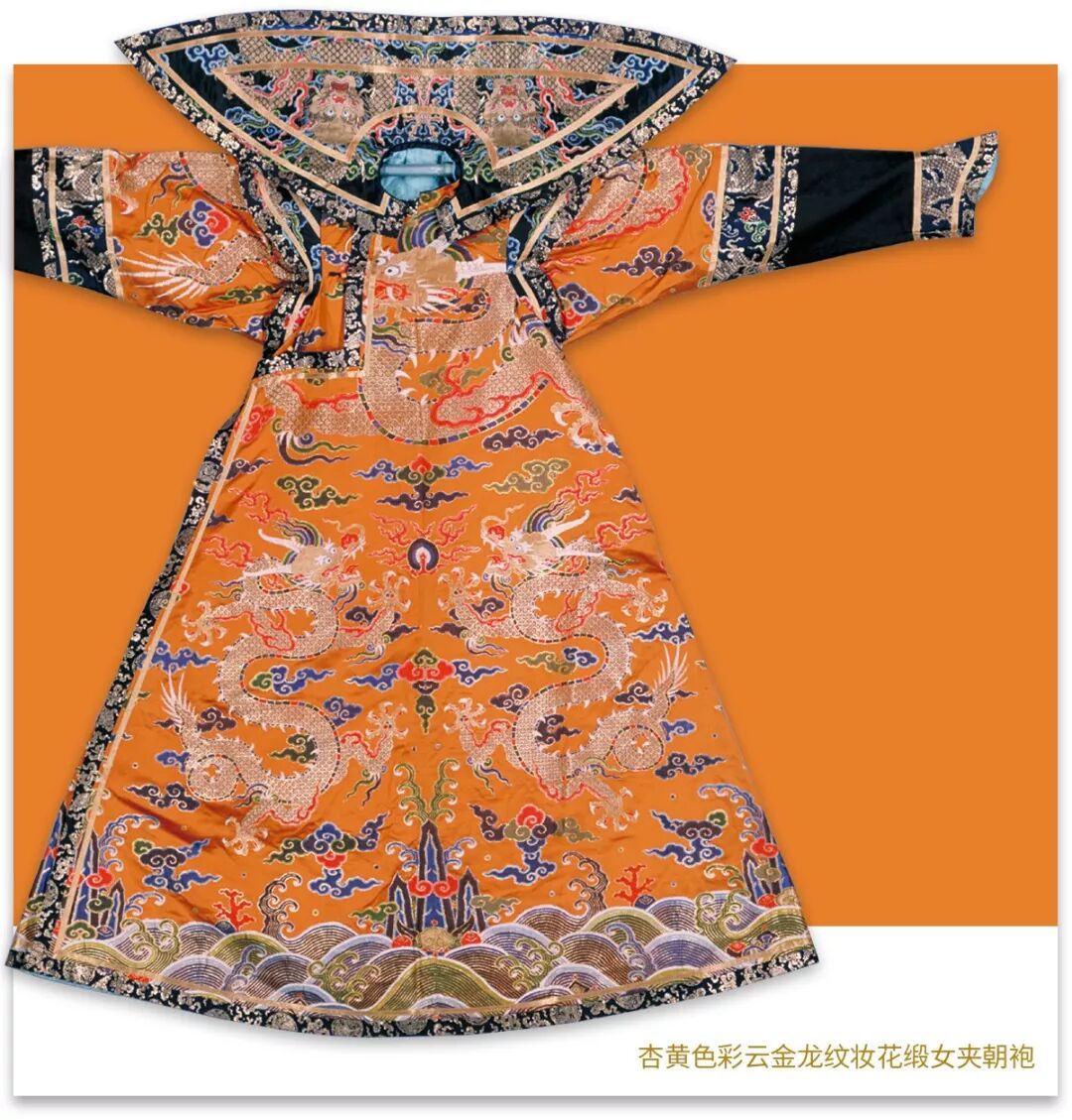 杏黃以杏實名色,即微微發紅的黃色,在清代服色等級中僅次於明黃。乾隆朝《皇朝禮器圖式》中定皇太子及其妃袍色用杏黃。