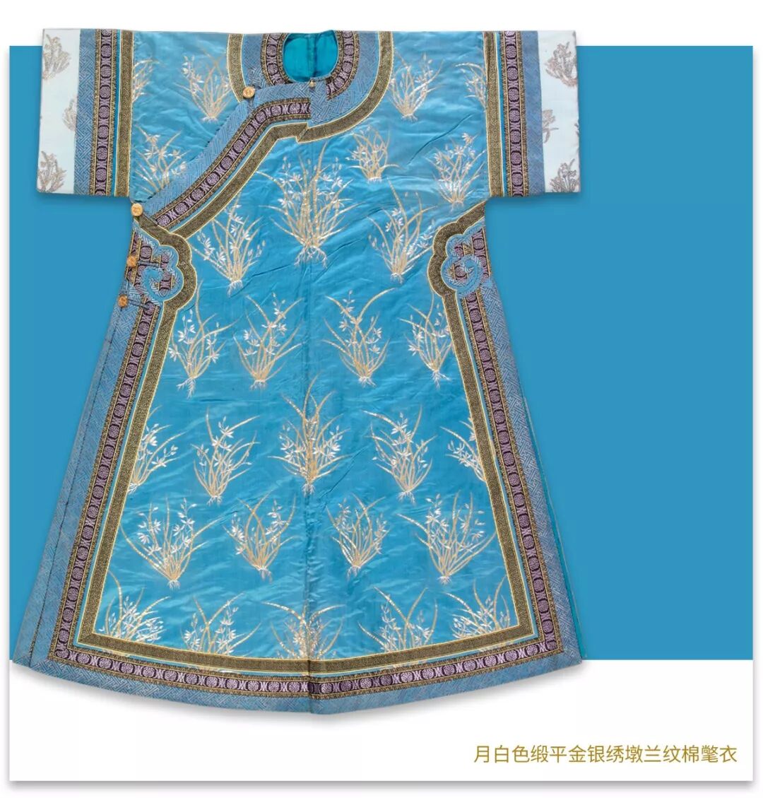 此氅衣基調月白色,金銀繡蘭花既寫實又富於裝飾性,一派嫻靜中又有皇家的顯赫華燦。