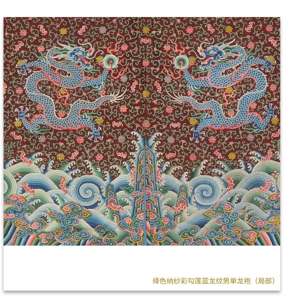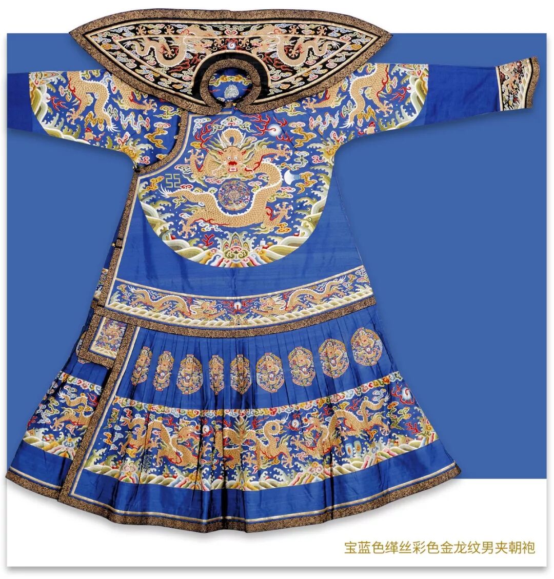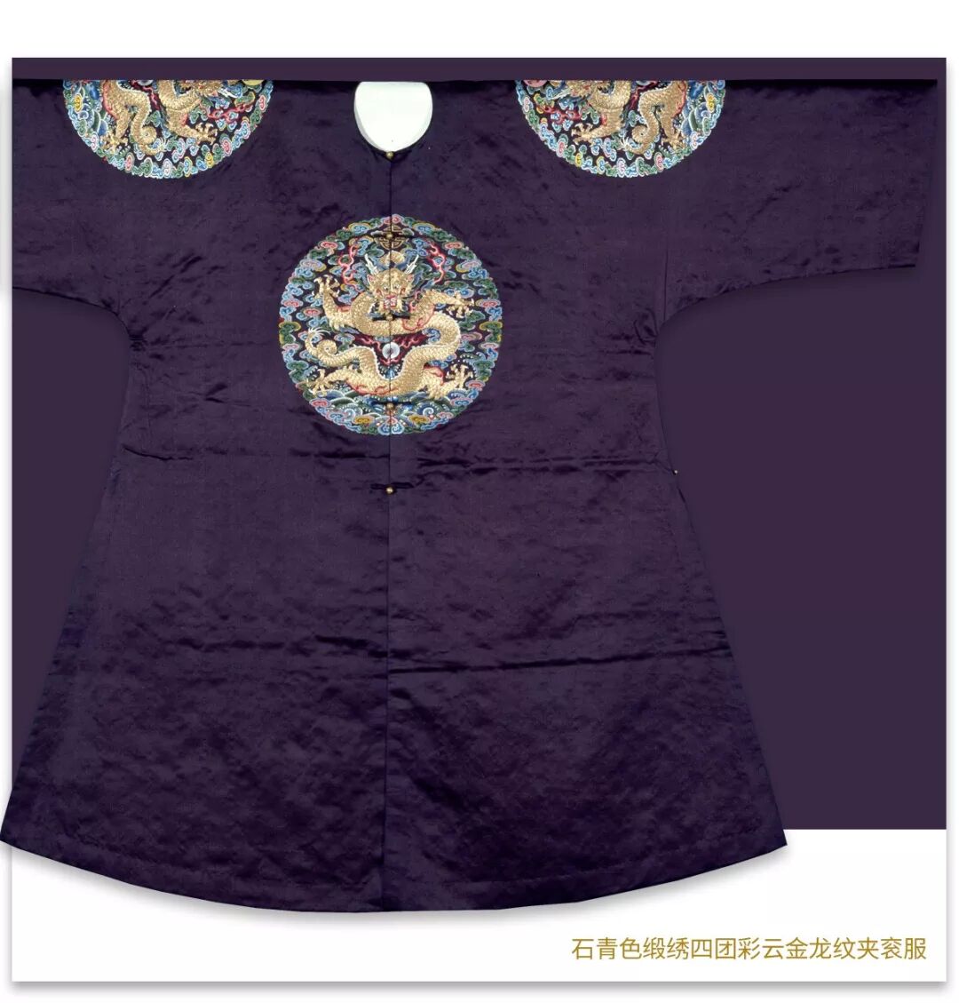 石青,即深沉、莊重、純粹,有金石般堅硬質感的青色,《大清會典》中規定:“皇帝袞服,色用石青”“皇后朝褂之製三,皆石青色”;王公大臣文武百官最隆重的朝袍、補服也都是石青色。且即使是黃、紅、藍、絳等諸色袍服,大多要鑲飾以石青片金的邊緣,綜袖也大多用石青色。所以總體看來,石青色倒像是清代宮廷服飾審美的核心色彩。