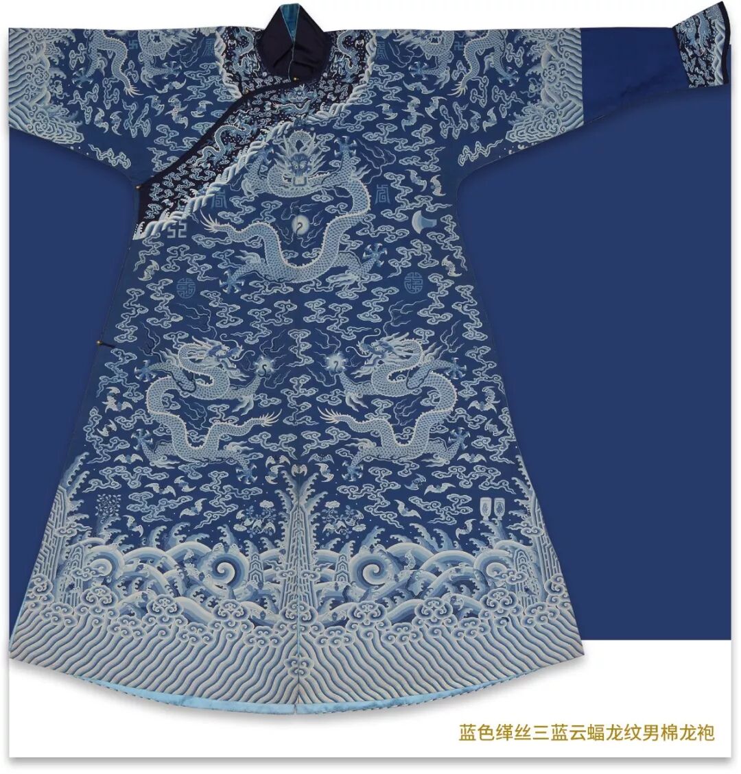 除了將袍服主體龍紋修飾成藍色,清代人還有一種特別的服色“三藍”,即衣料上的主要紋飾如雲蝠等,甚至是緣飾外的所有紋飾和地子都以藍色為主。