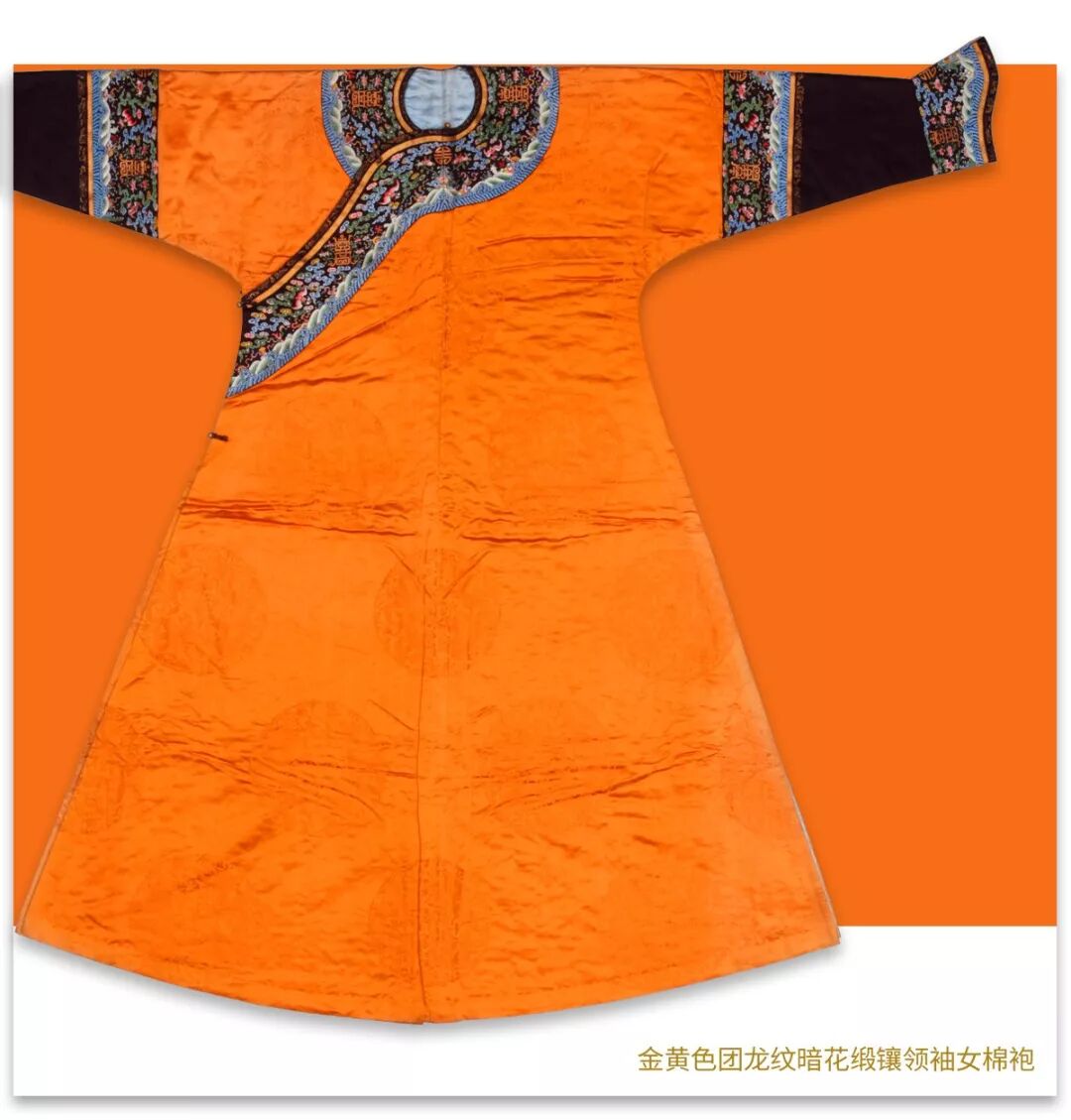 清代所謂金黃色即黃色中混合了紅色,比杏黃更紅,有時近於橘紅色。清代宮廷中貴妃袍色用金黃,皇子冠服也用金黃色,但一旦皇子封王分府,則親王郡王袍服一般都不能用金黃色,除非“曾賜金黃者,亦得用之。”可見金黃也是皇家重要的標誌色。