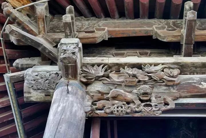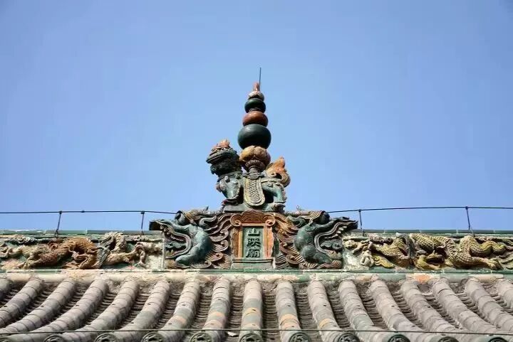 山門後面是舞樓(戲樓),舞樓的建築設計獨具匠心,精雕細刻。舞樓面闊五間、進深三間,總體成“凸”形,舞台前出。採取前歇山後廡殿建築形式。舞樓上的屋脊都是琉璃構件,經過數百年風霜雨雪,依然色彩鮮豔。其裝飾達到無木不雕,無木不彩、無處不畫之地,圖案精美,彌足珍貴。屋頂清代製作的各類人仙、龍鳳、禽獸、花卉裝飾,造型栩栩如生,油彩依然亮麗。