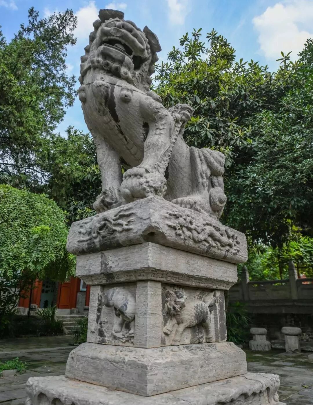 對會館裡印象深刻的莫過於這些石刻藝術了,特別是歷經四百餘年仍能保留至今的明代漢白玉彩繪石獅,實屬罕見。還有大殿上柱礎石的雕刻也不可錯過,金睛獸馱蓮花、獅子馱蓮花、麒麟馱蓮花,十分生動。