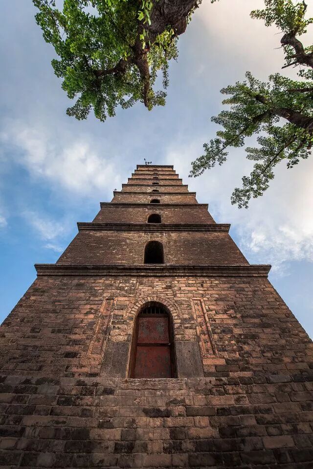 齊云塔始建於漢明帝,初建為木塔,後毀於雷火,至金大定十五年(1175)得以重修,故又稱"金方塔",為四方形密檐式磚塔,距今已有八百多年的歷史。塔邊長7.8米,通高35米,13層。第一層塔檐之下飾砌以仿木構式斗拱,頂覆寶瓶式塔剎,外輪廓略作拋物線形,玲瓏挺拔,古雅秀麗。每層南邊開一拱門,可以登臨眺望。