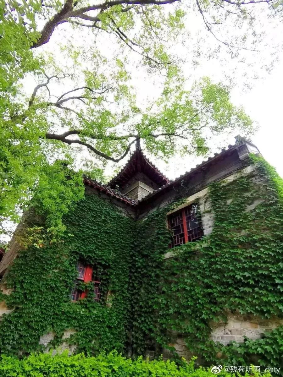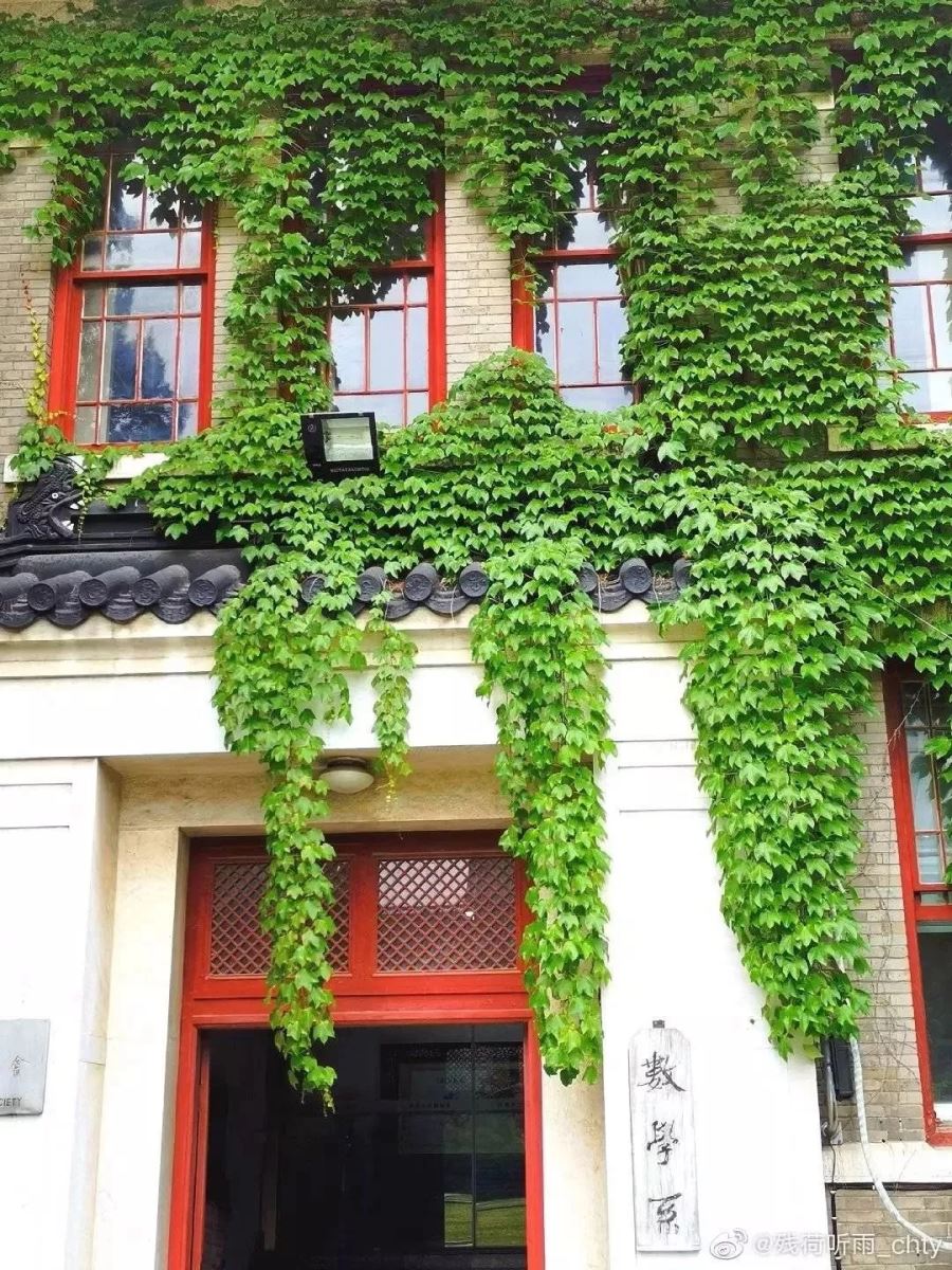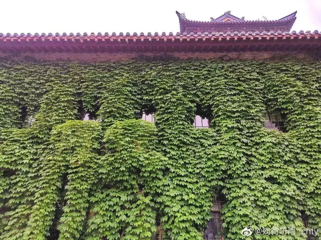 南京大學的一座百年老建築被爬山虎佈滿,遠遠望去猶如一個童話裡的綠色城堡,浪漫至極。