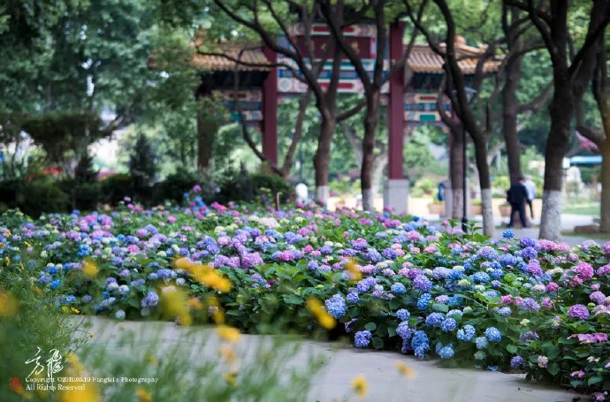 那數千株散植各處的繡球樹上,一朵朵小花聚集成一團團球形花朵,花團錦簇,綠葉襯托,將公園裝點得星星點點、異彩紛呈。