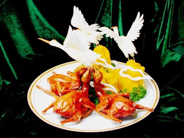華苑酒家的乳鴿從食材選擇上也頗講究,保證新鮮,並且處理得當,徹底去除血水,再進行製作。其特點不是脆皮,而是用滷汁滷完再炸,這樣製作出來的乳鴿的汁水不會流失,口感極其鮮嫩美味,滷汁內加入了少量糖,炸出的鴿肉香甜鹹,味道入骨。