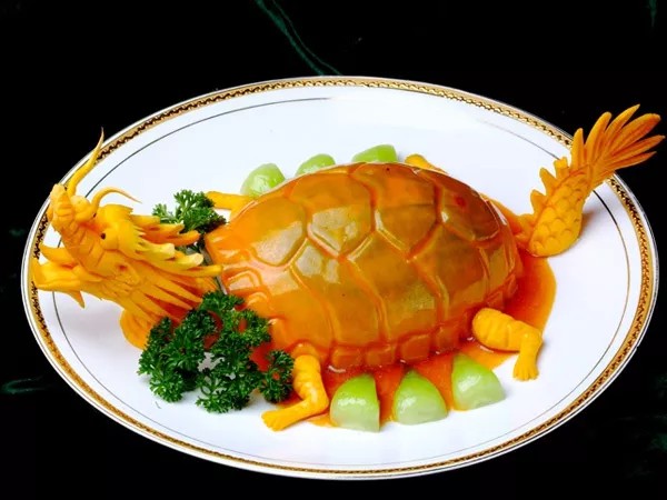 “金龜燴珍寶”有一更具黃埔本土氣息的名字——長洲金瓜扣河鱉。長洲平坦肥沃,盛產南瓜,河湧交錯,常有野生大水魚,該菜式便是以盛產於黃埔區長洲島的南瓜和甲魚入菜。“南瓜刻龍龜,猛火炒甲魚。”廚師將南瓜雕刻成龍龜形狀,扣在燜煮好的甲魚之上, 造型逼真,是色、香、味俱全的一道美味佳餚。