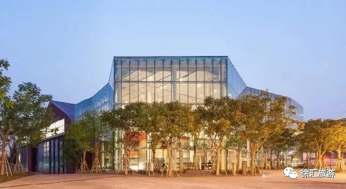 曾經,這裡是上海飛機製造廠的機庫,鐵鏽紅色的建築主體在江水綠樹的映襯下分外醒目。
