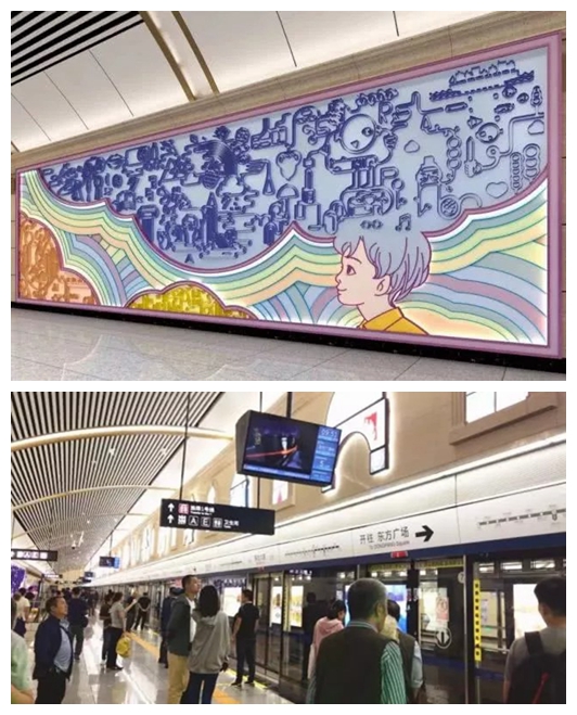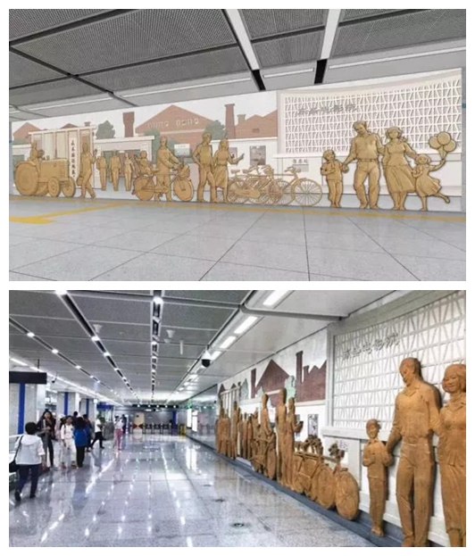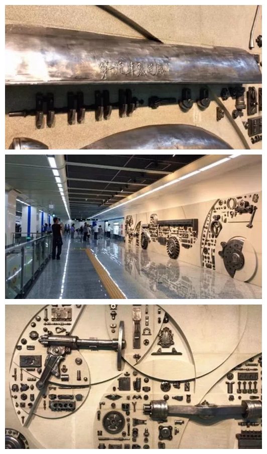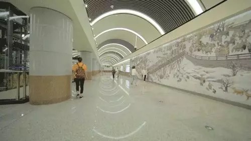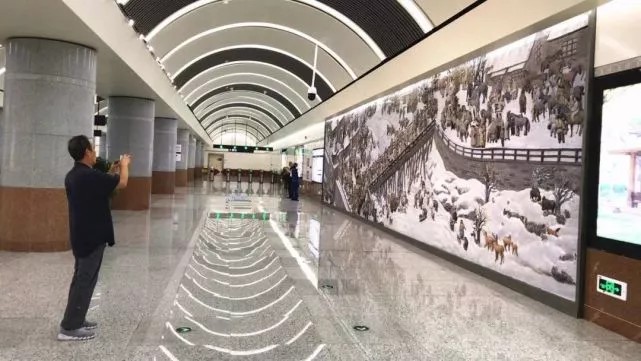 文化廣場就比較文藝了,用大陸畫寫意的藝術語言,將長春最具代表性的新老建築鋪陳在乘客面前,第一汽車製造廠、長春電影製片廠、偽滿皇宮博物院……氤氳的水墨,喚起長春人的時代記憶,呈現出一幅水墨春城的美麗長卷。