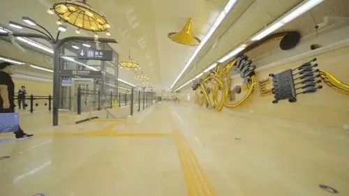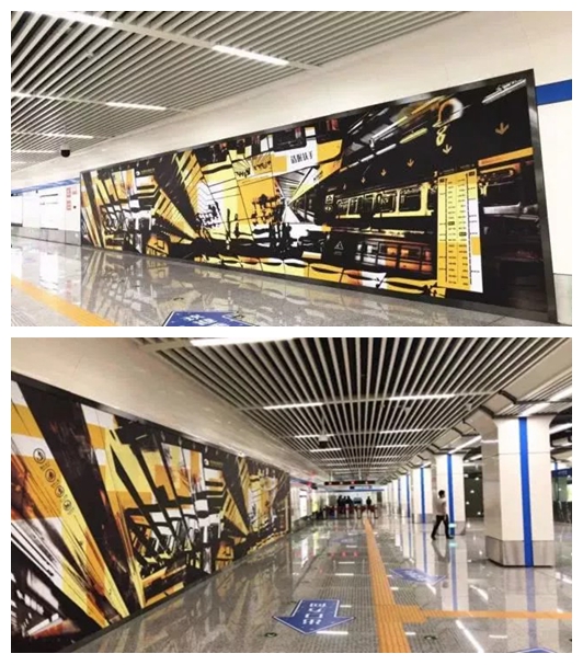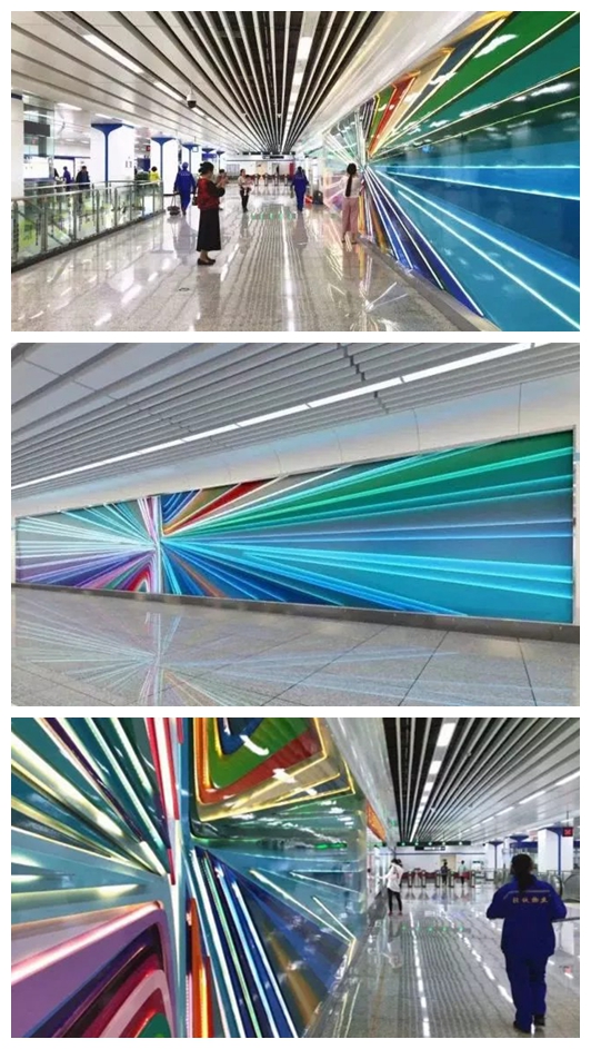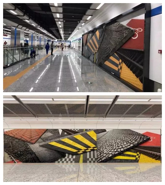 平陽街站的主題是美的維度,這附近是老城區,但是站內卻超級具有現代感。作品運用波普藝術的語言,以飽和跳躍的色彩和空間的誇張透視與重組,構成了一個“地鐵中的美術館”。