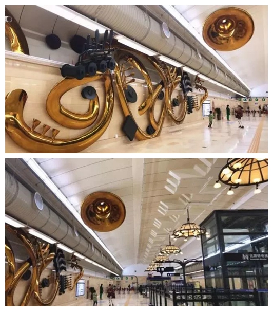 “時代樂章”的主題設計結合站廳層空間裝飾偏西式的古典風格。呼應著建設廣場周邊戲曲、藝術院校眾多的區域特色,奏響了長春繼往開來的時代交響曲,可以說和長春這座歷史文化深遠的城市很貼合了。
