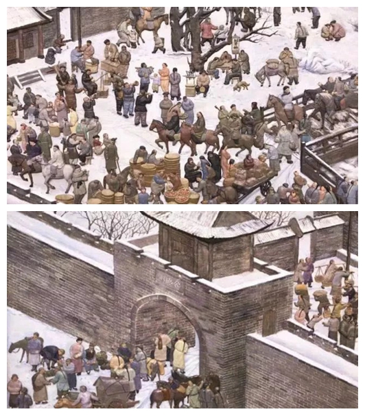 南關站附近過去曾經是著名的豆市、馬市,是舊日長春商貿的集散地,也是東北亞地區對外出口貿易的重要窗口。這件具有中式畫線描風格的作品生動地描繪了老長春經濟發展、市民安居樂業的繁榮景象。