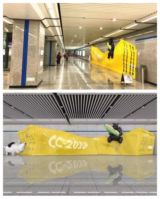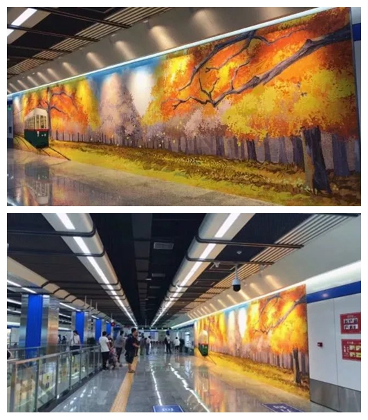 說到電車,肯定是很多長春人記憶中最熟悉的畫面。這一站採用開放式構圖,配合地舖裝飾,用拼貼手法表現了在富有懷舊氣息的金秋時節,電車在落葉中徐徐駛來的場景,打造出身臨其境的視覺體驗。這波兒回憶殺,你喜歡嗎?