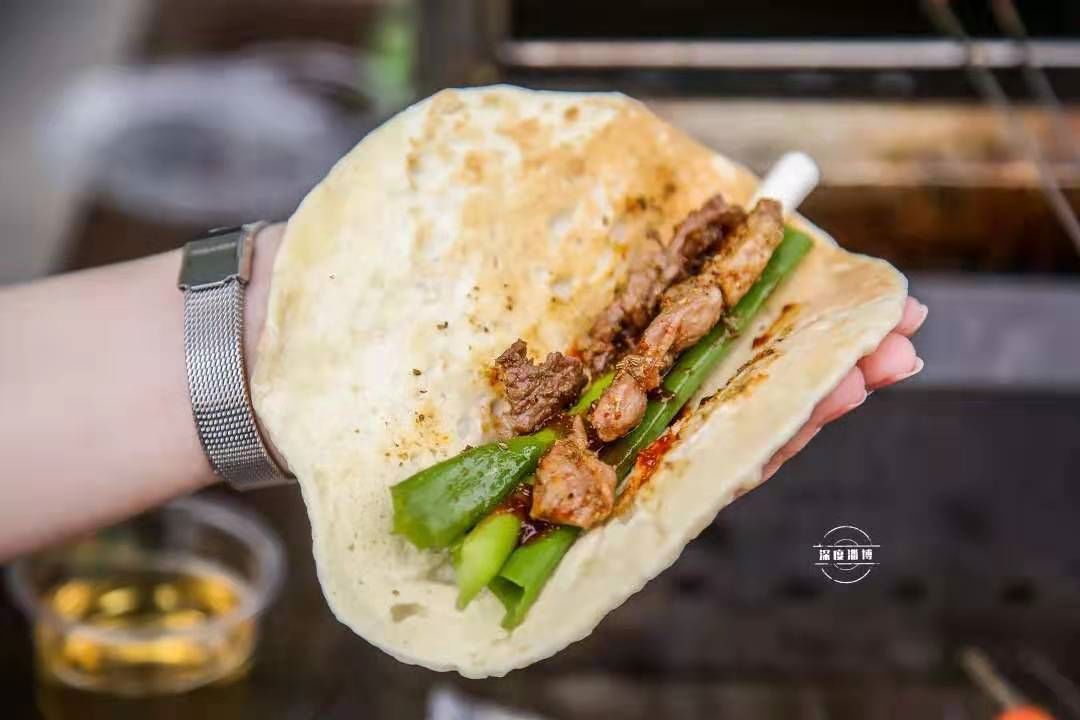 到了凌晨一兩點,淄博的路邊是成片擼著串喝著酒的食客們,他們圍著一個個燒烤爐,用特有的小餅卷上烤好的美味,這是獨屬於這裡的美食時刻。