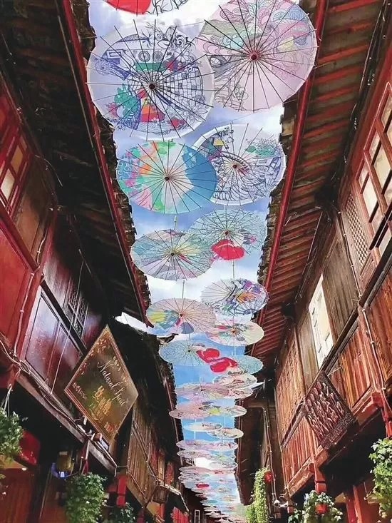 “撐著油紙傘,獨自徬徨在悠長、悠長又寂寥的雨巷。”一條曲折通幽的小巷,腳下是青石板路,頭頂懸把把色彩鮮明的油紙傘,花鳥蟲魚各不相同,隨風搖曳生姿,惹得路人心神蕩漾,駐足拍照。