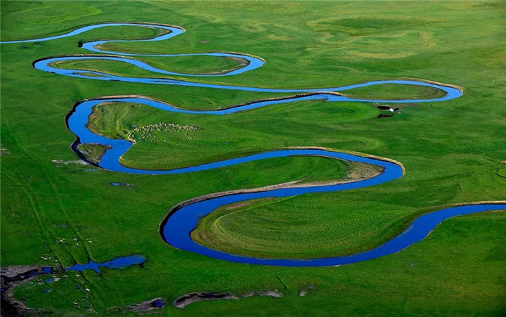 穿過草原腹地,曲曲折折的中俄界河額爾古納河在公路旁蜿蜒。在七卡和五卡之間有一處景觀,被當地人稱為太極圖,由於額爾古納河河道變遷,形成酷似太極圖案的自然景觀,一路九曲回腸,匍匐蜿蜒,在草原靜靜流淌。對岸的俄羅斯山脈起伏如畫,異域風情的邊陲小鎮集聚在草原上,濕地縱橫 、牛羊如梭、清風作陪,一路美景足以讓你忘卻世間紛擾,安放不羈的靈魂。