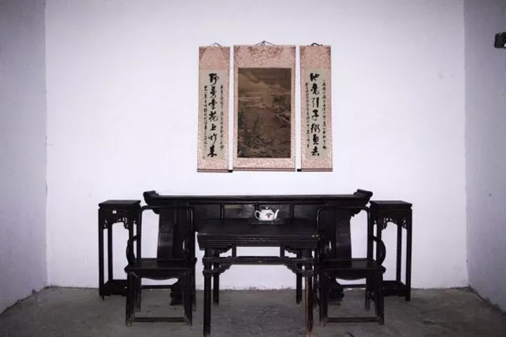 走進室內,一個中式佈置的廳堂裡擺放著兩張八仙桌和八張長條椅子,字畫楹聯透著一種古色古香的韻味。