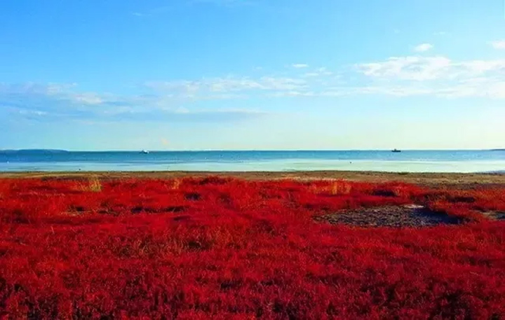秋天除了彩林還有一片紅海灘,一棵棵纖弱的鹼蓬草釀造出一片片火紅的生命色澤,成就了一個令人始料不及的美妙景觀……