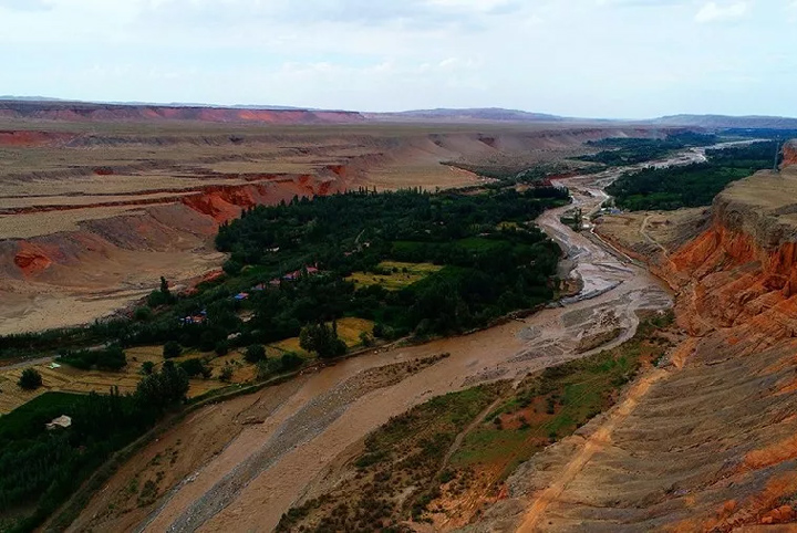 臥龍谷位於新疆和闐策勒縣恰哈鄉玉如克塔什村,遙遙望去,它酷似一條彩帶迂回盤曲,在大地上蜿蜒飄舞。紅黃相間的地層陡峭幽深,層層疊疊堆放在一起,任憑策勒河靜靜地從谷底流向遠方。當你被昆侖山神秘吸引,虔誠地走近大山的時候,你會被眼前的一切震驚,仿佛誤入世外桃源:農用車的轟鳴聲、小孩嬉戲打鬧聲、雞叫聲、狗吠聲……聲聲入耳。分明還有紅色的屋頂散落在樹林和河谷邊……這裡就是臥龍谷。