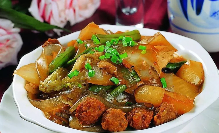 山西大燴菜是農家菜譜的常見小吃。大燴菜內容較為豐富,湯鮮味厚,營養豐富,老少皆宜。大燴菜的主要原材料一般是肉片、炸豆腐、土豆塊、炸肉丸、黃豆芽、海帶、粉條、茄子、豆角等各種蔬菜。