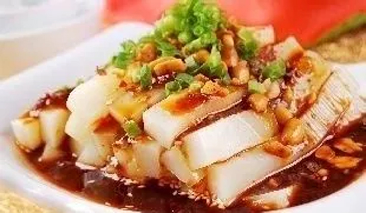 涼粉是山西省的一道特色小吃,是以土豆澱粉、豆腐乾、蠶豆為原料製作而成。做好的涼粉清亮、滑嫩、爽口,像豬皮凍似的“筋顫”。拿在手上“滑溜溜”,吃在嘴裡“涼絲絲”。風味獨特,堪稱一絕。