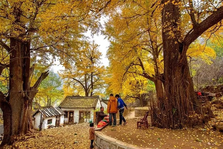 等到霜降之後,銀杏葉迅速變黃,仿佛進入了金色海洋,道路兩旁,盡是安靜的白牆灰瓦,那些門前院內,扇形葉片的銀杏樹從疏疏落落到成林成片,沿途落下的銀杏樹葉鋪就了一條鬆軟的路,踩上去有輕柔的聲響。