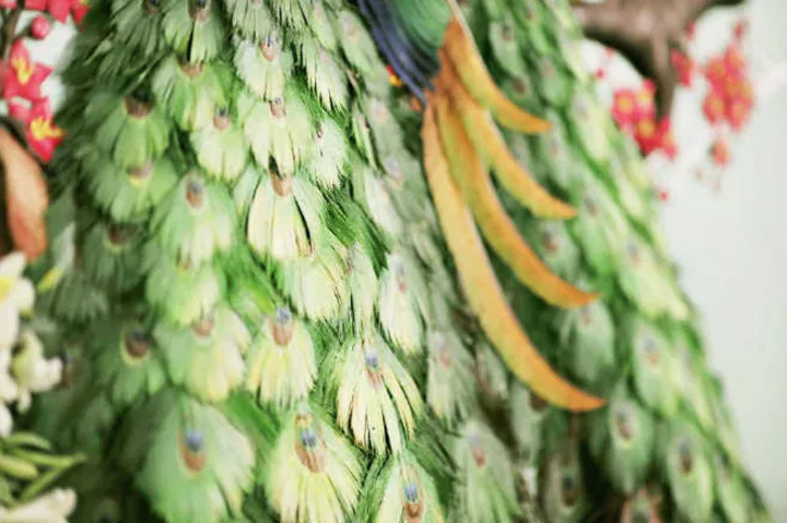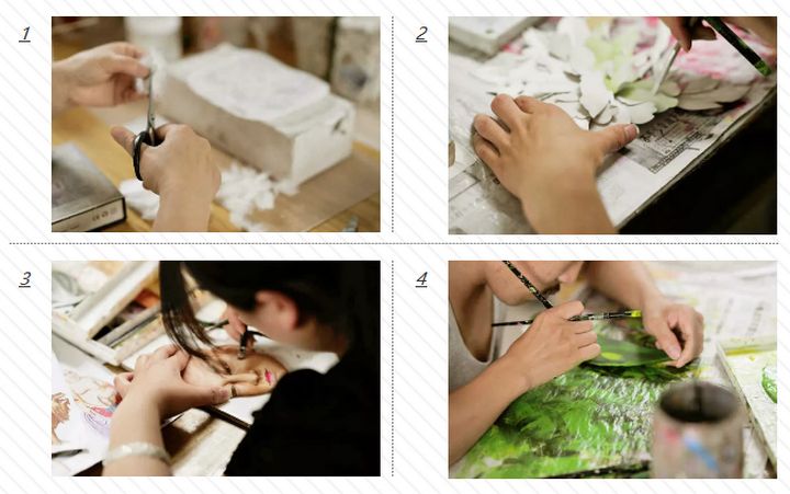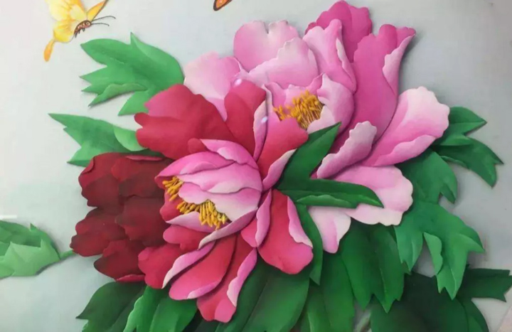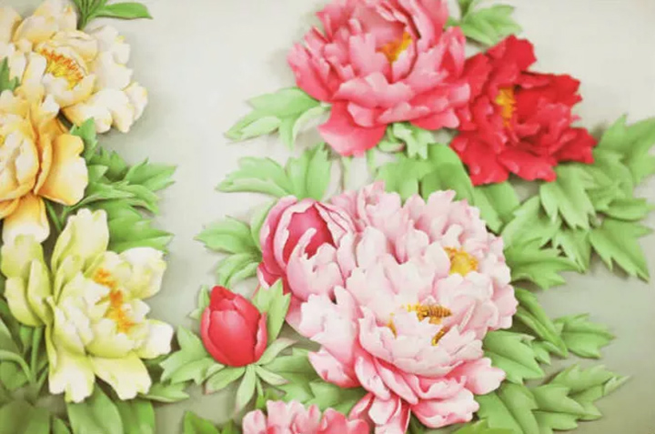 將加工製成的片狀半成品,用特製顏料繪製人物臉、手等部位,而後用金銀彩線和珠寶裝飾,然後將此半成品拼貼於已繪好場景的底板上,最後裝入玻璃木框中。