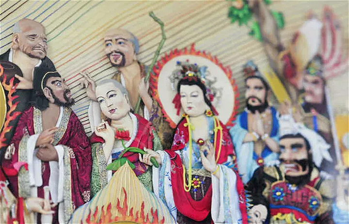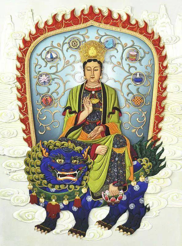 堆錦中的人物栩栩如生、動物活靈活現、花草逼真誘人,尤其是堆制出的佛和菩薩的造像,不僅體現出了傳統佛教藝術中的莊嚴、肅穆和神秘的色彩,而且成功將溫柔婉約和崇高莊嚴的美感同時展現在一副畫卷之上。