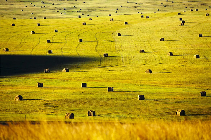 秋日的呼倫貝爾,一幅幅油畫般的美景鋪天蓋地而來,藍天白雲下,一望無際的草原變得柔順,黃了的牧草收割下來,打成半人高的結實草捆,錯落有致地散佈在山腰坡間,黃酥酥,圓滾滾,好像地毯上和諧立體的圖案,這是秋季草原上特有的亮麗風景。