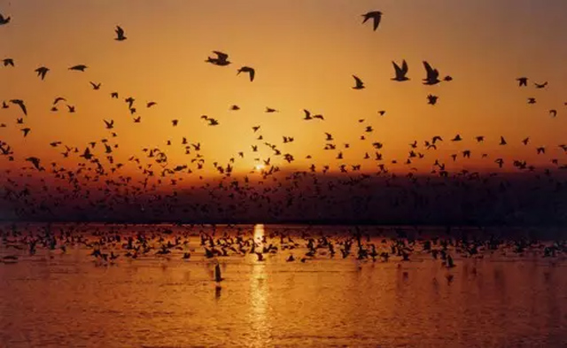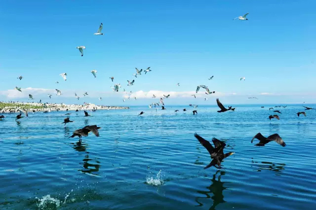 候鳥遷徙飛抵北戴河沿海濕地時,看群鳥振翅飛翔,擊起千層浪花。