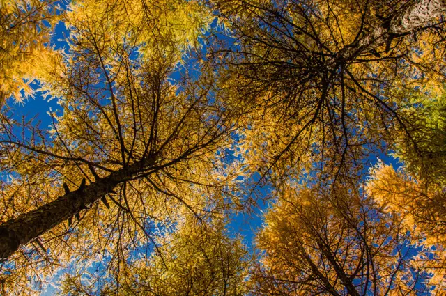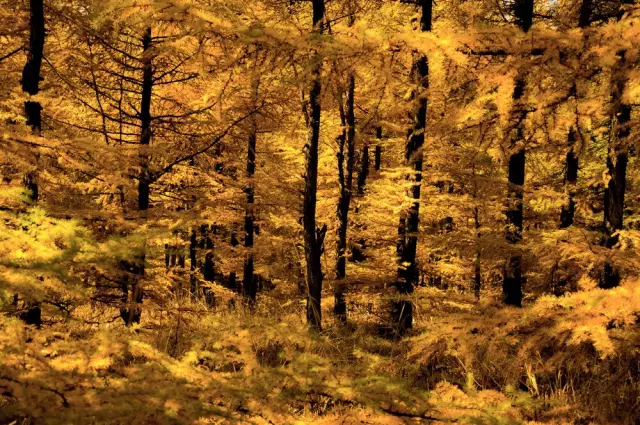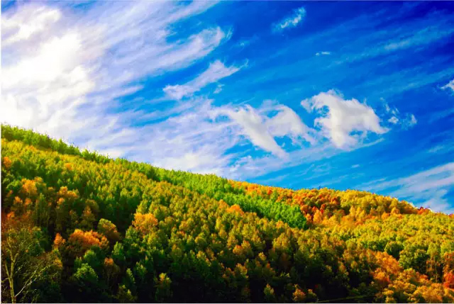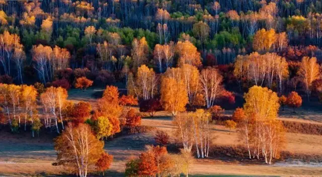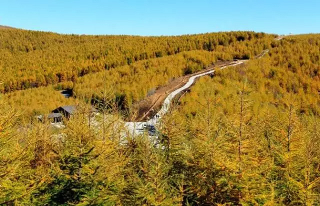 順著天路蜿蜒而上,茂密的原始白樺林一片接一片,前面一段是夾雜著松樹,黃黃綠綠,越往西去,漸漸變成金燦燦的一顆顆緊緊相連,宛若潑灑顏料一般。