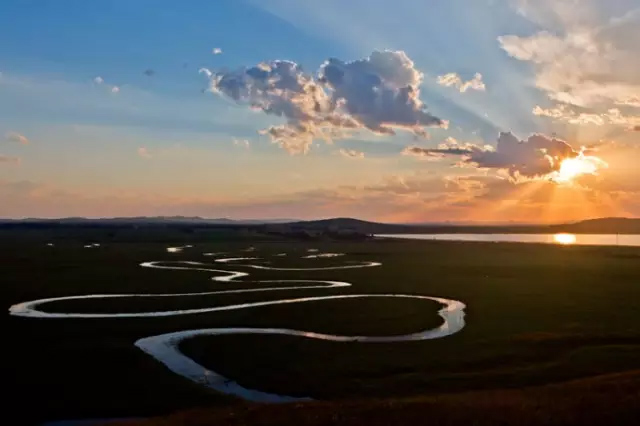 閃電河,是灤河的源頭,越山林,過湖泊,迤邐前行,在沽源遼闊的濕地草原上恣意流淌,九曲回折,意韻悠長。灤河神韻,形成了沽源的又一標誌性景觀。彎彎曲曲的河流像溫柔婉約的女子輕輕揮舞飄渺的彩練,忽隱忽現,或舒緩,或纏綿,或婉轉,蜿蜒纏繞在草原之間。