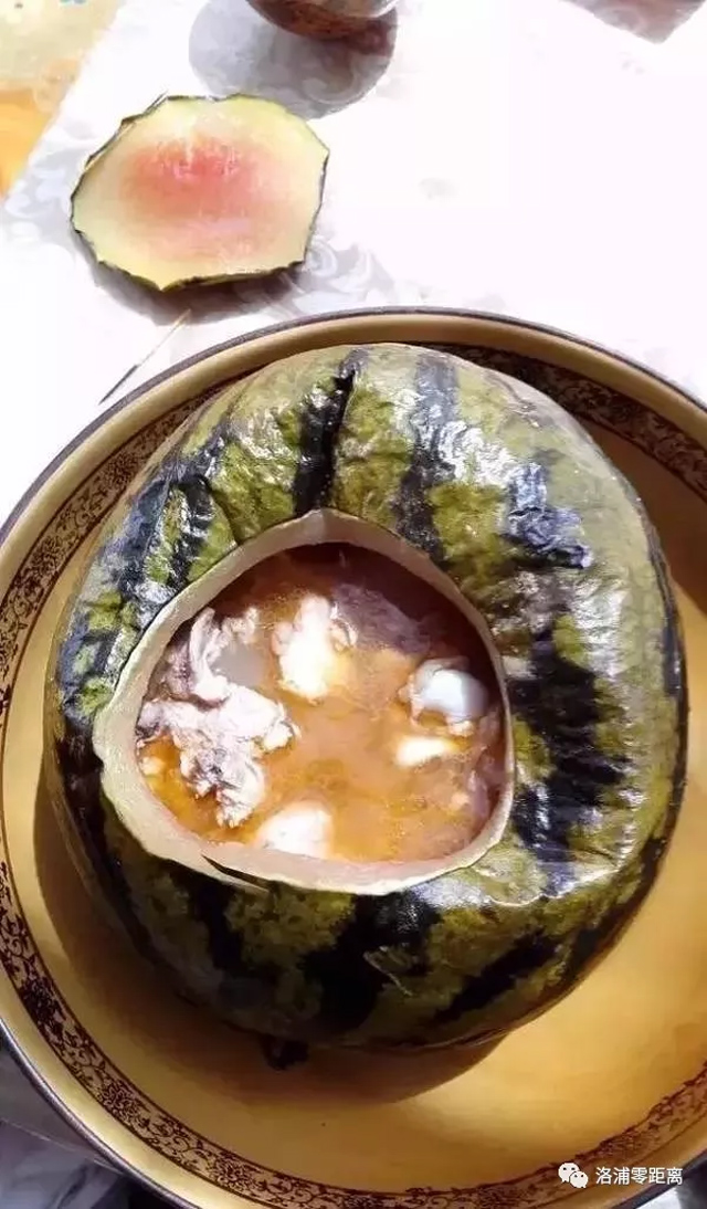 西瓜烤肉,是和闐一道獨特的美食。饢坑裡,一個個足球大的西瓜被削開了頂部,綠油油的外皮已經被烤的發黃,揭開西瓜蓋子,裡面的羊肉散發出陣陣鮮味兒。